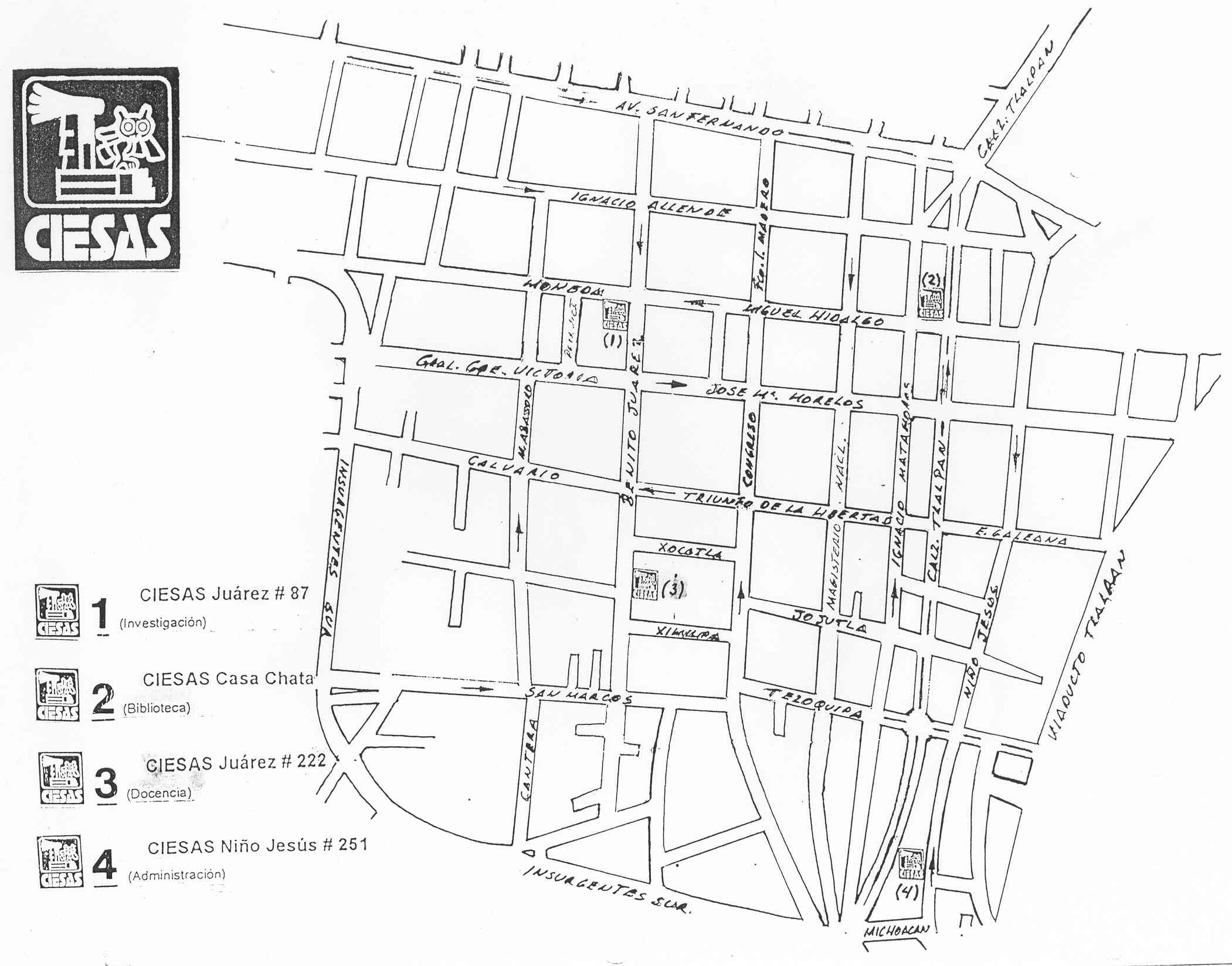 Detail of the center of the Tlalpan district. This gives the location of the four CIESAS headquarters. The one we want is the one marked with the number 3.